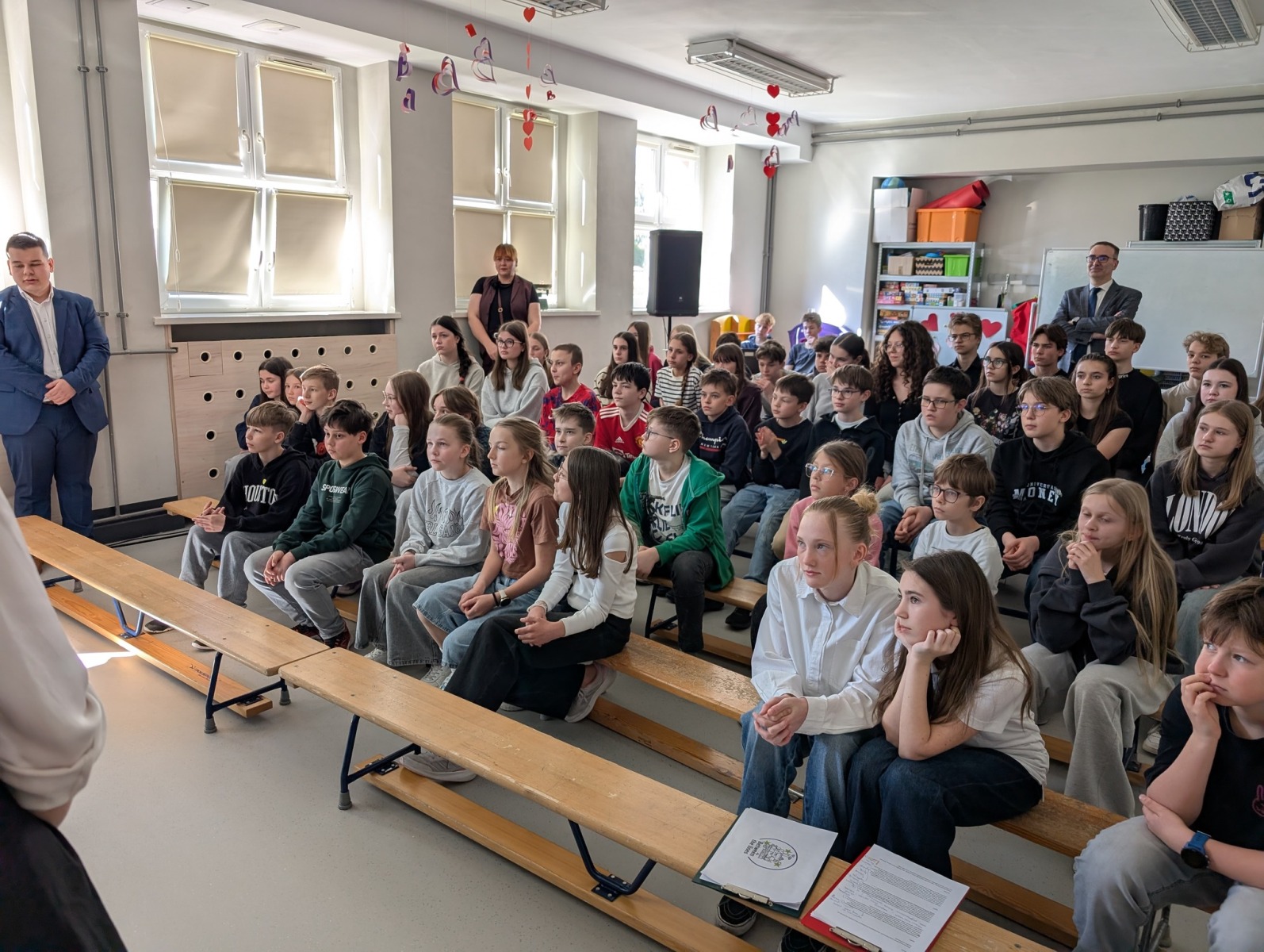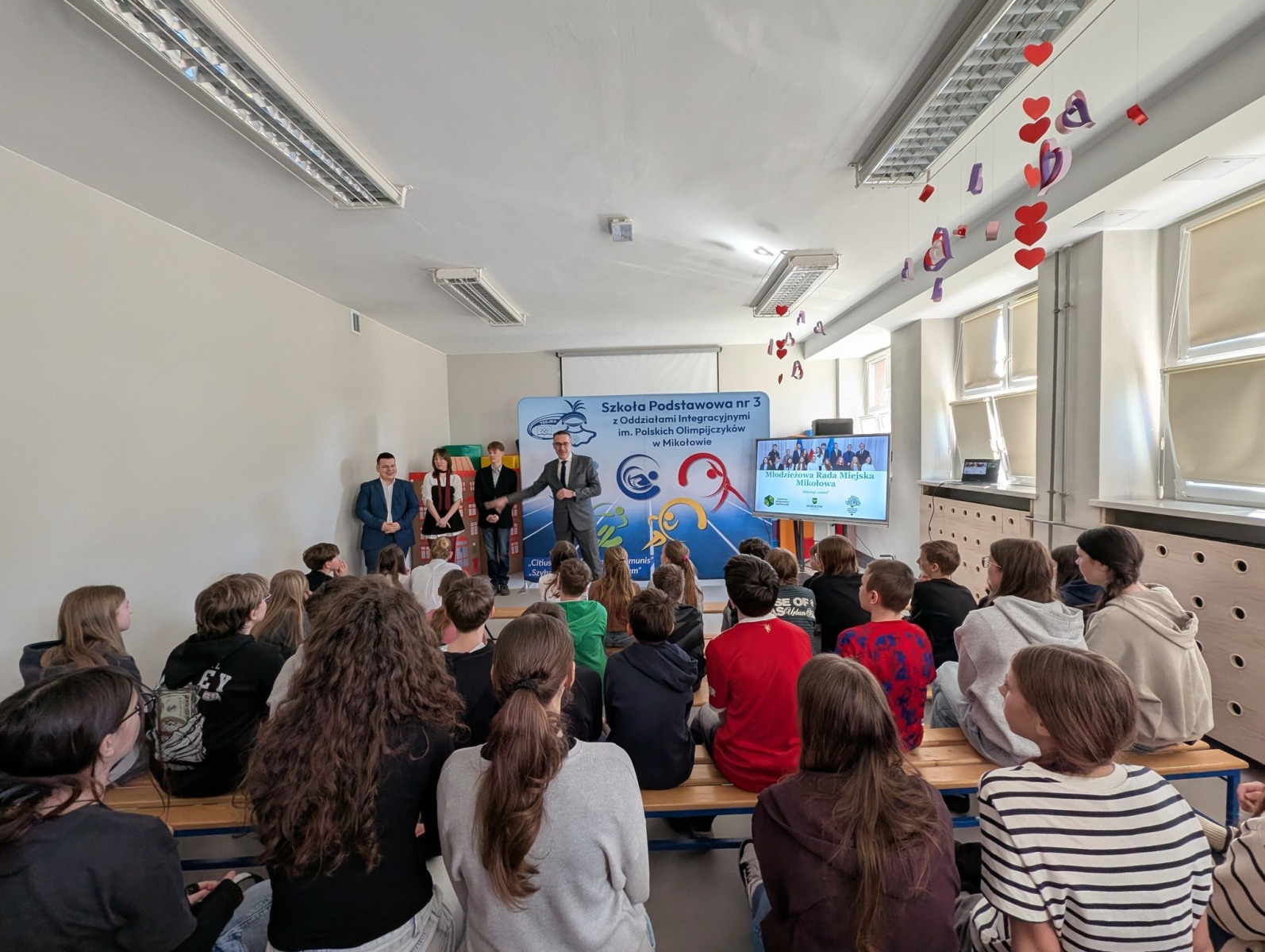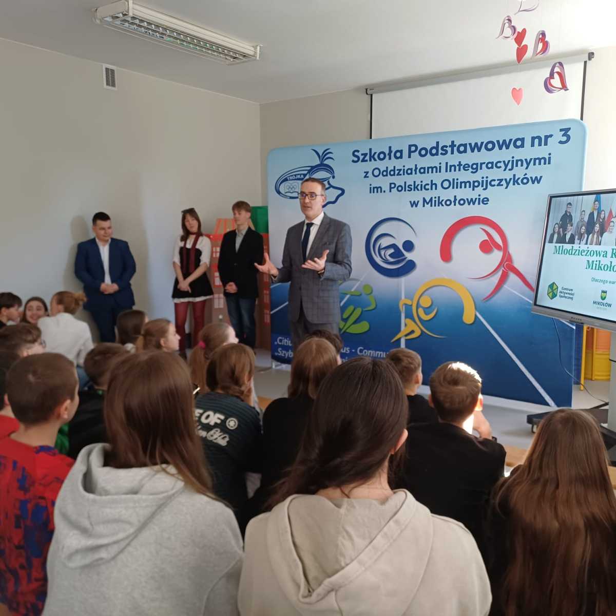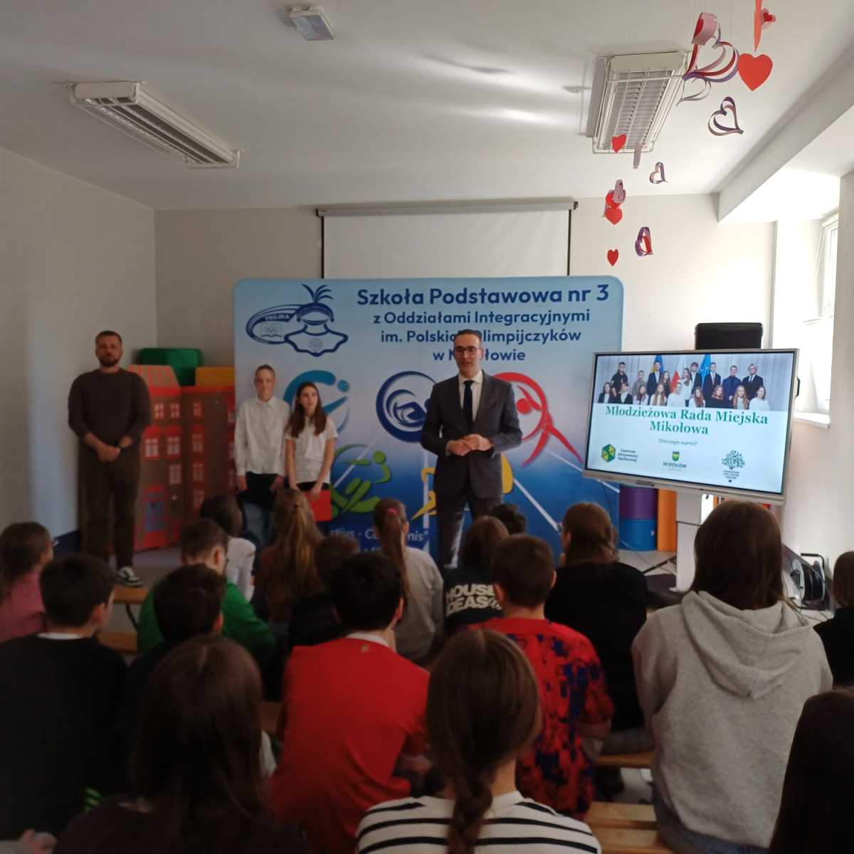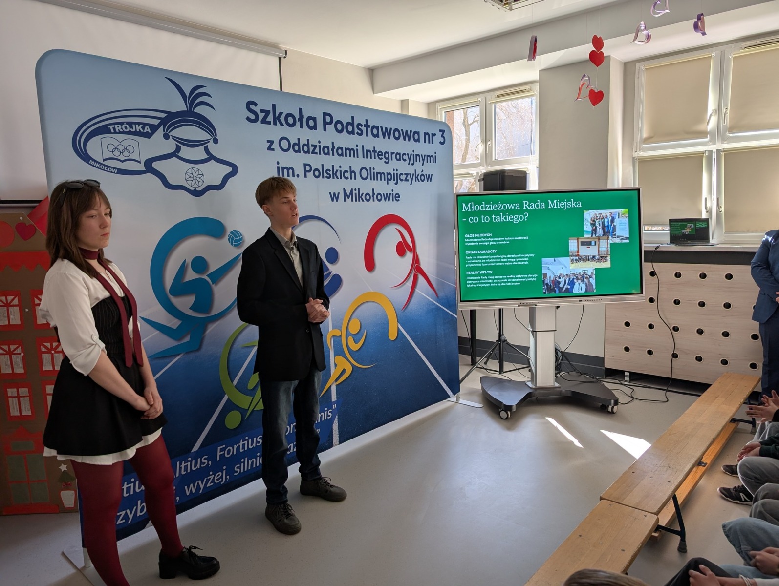 Młodzieżowa Rada Miejska Mikołowa i Mateusz Handel zaprezentowali naszym uczniom możliwość kandydowania i wstąpienia w ich szeregi. Już wkrótce nasi uczniowie będą mieli możliwość wystartowania w wyborach i uzyskania mandatu „radnej / radnego”.