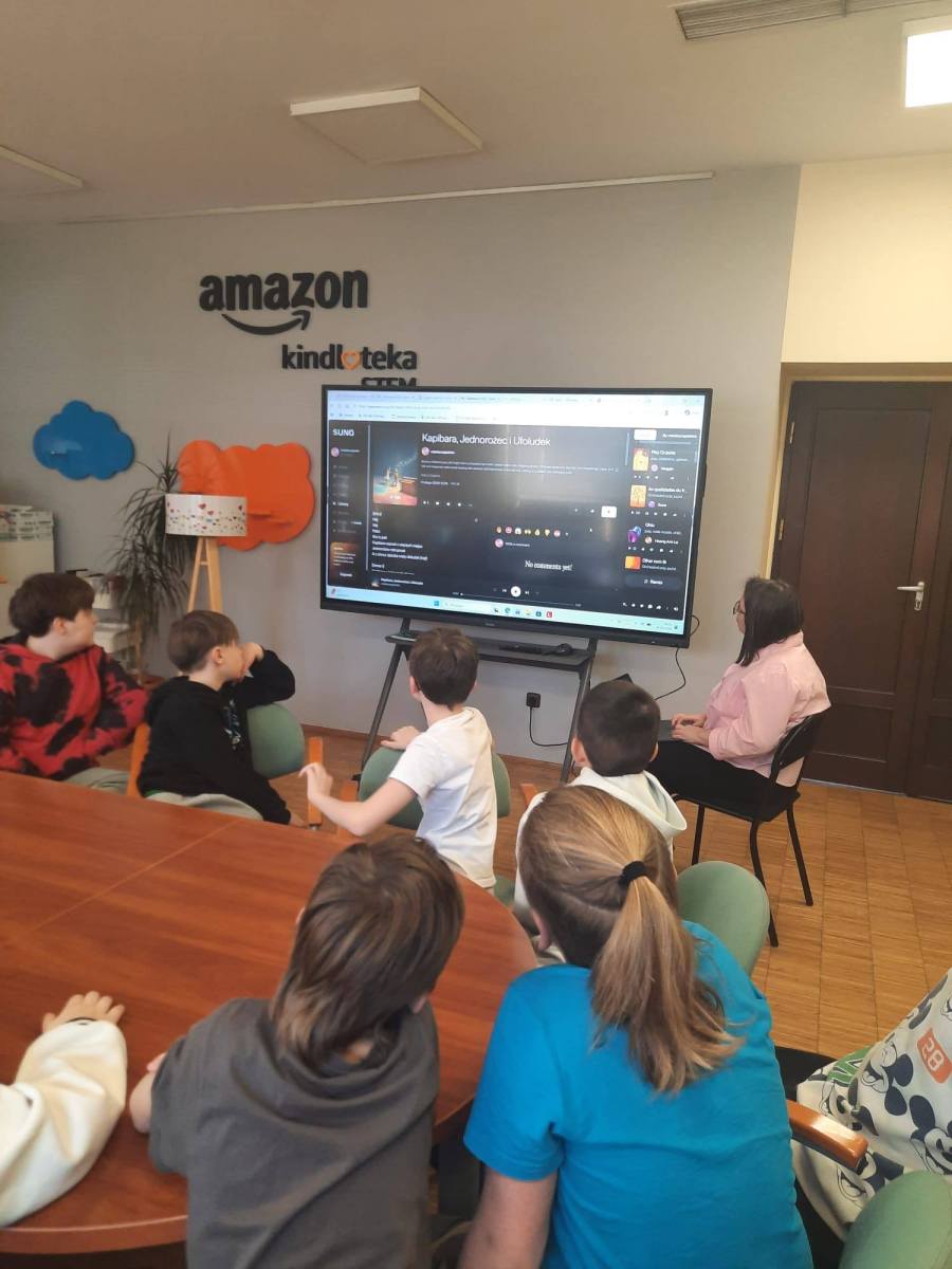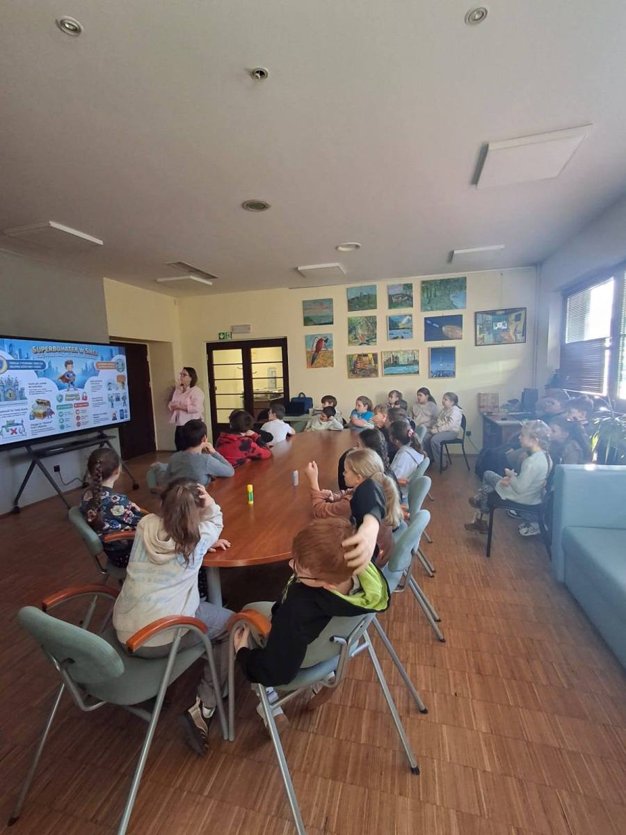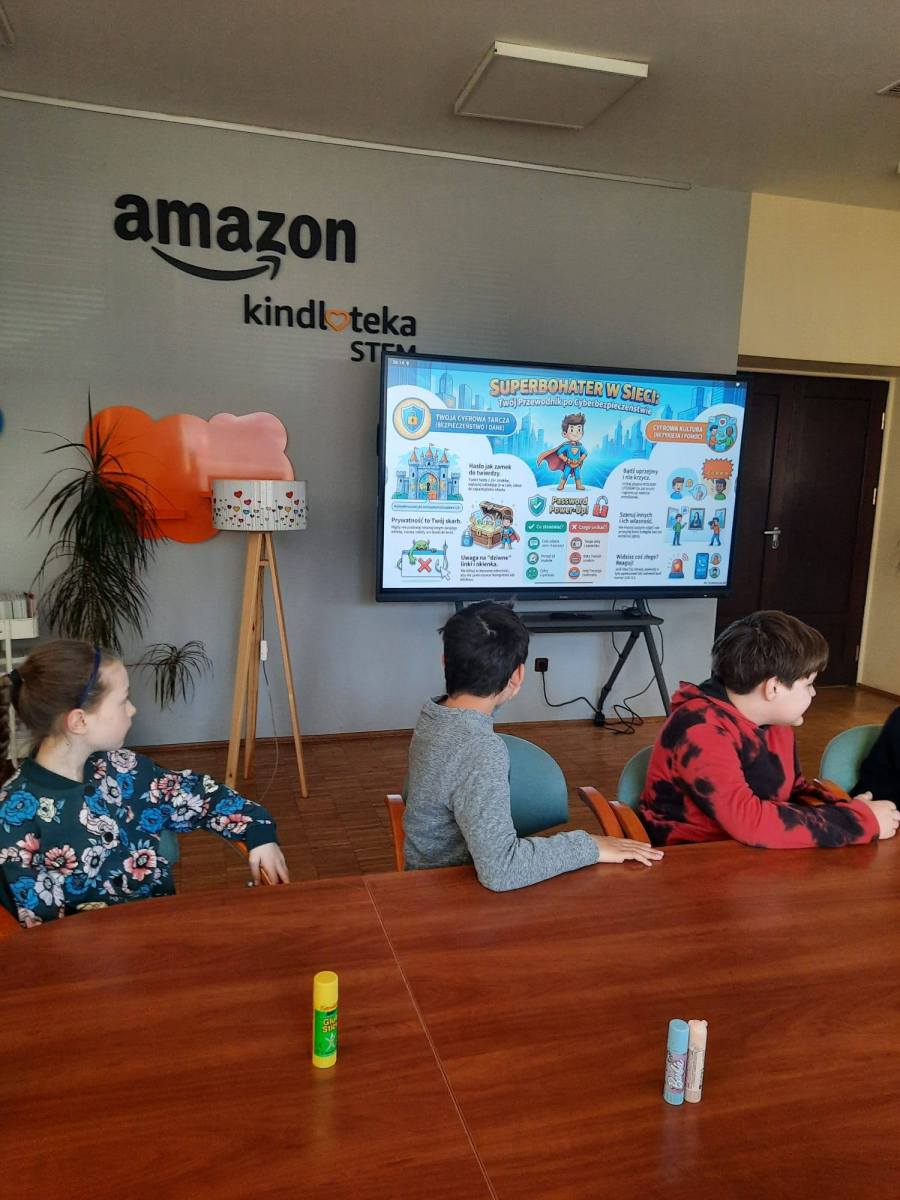 Uczniowie z klasy 3b uczestniczyli w kolejnych zajęciach w Miejskiej Bibliotece. Tym razem dotyczyły one zagrożeń w Internecie ( cyberprzemoc, kradzież tożsamości). Dowiedzieli się, że należy unikać podejrzanych linków. Nie zabrakło też informacji o uzależnieniu od gier komputerowych. Dzieci miały okazję zobaczyć, jak w pozytywny sposób można wykorzystać sztuczną inteligencję.