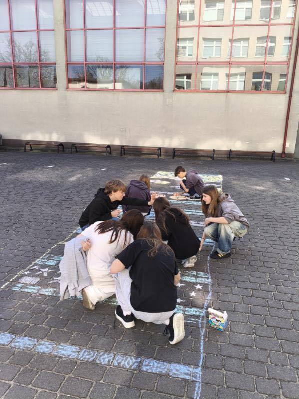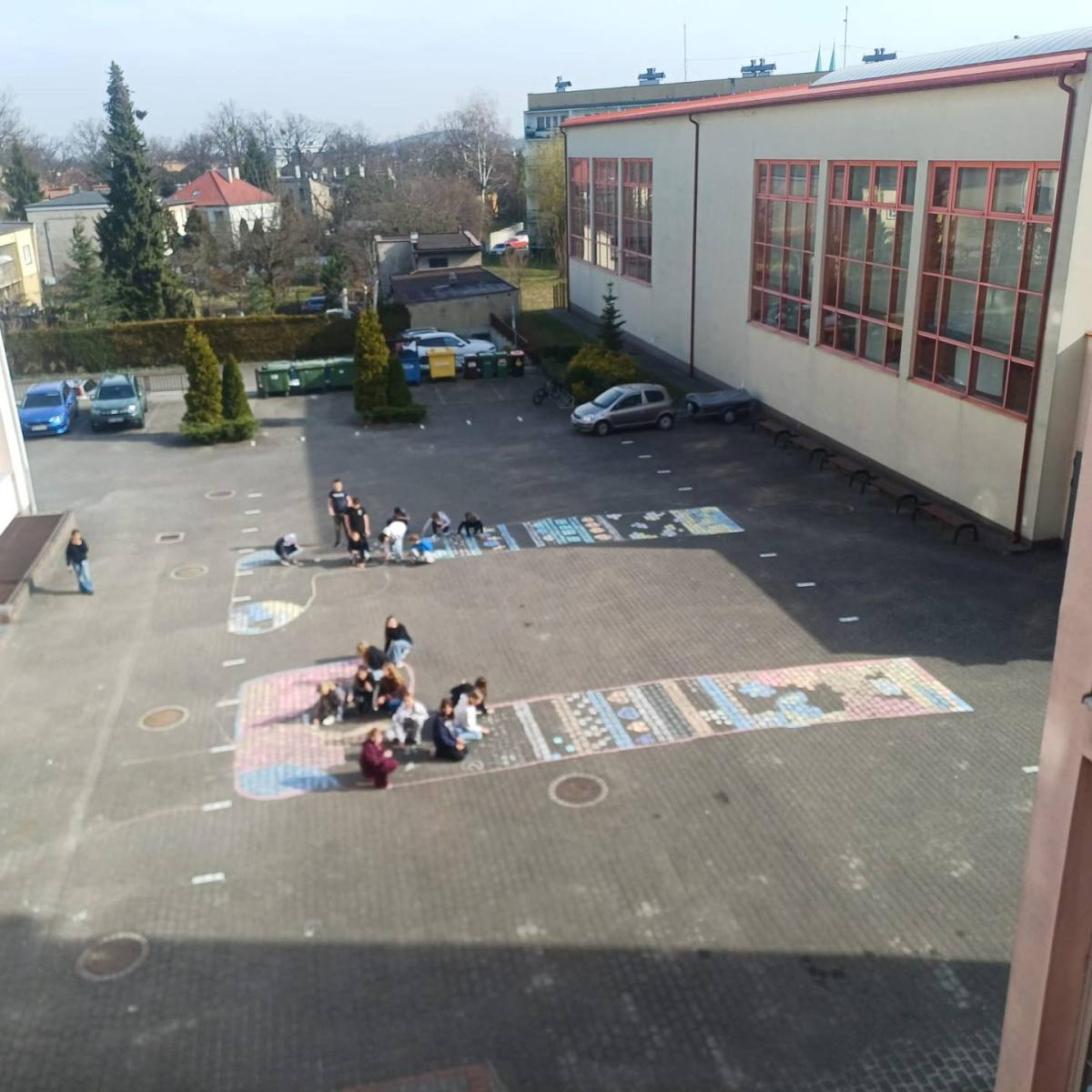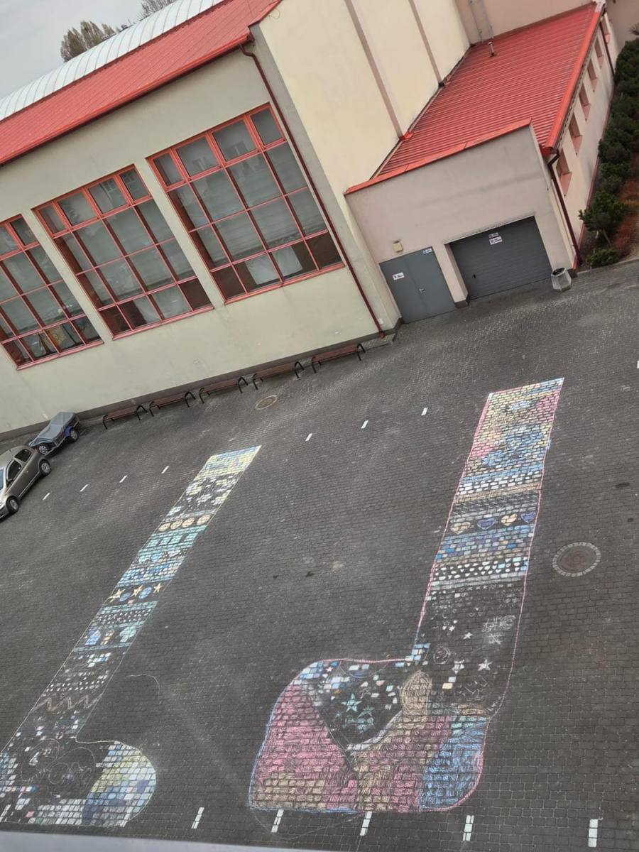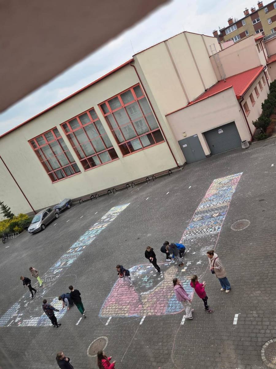 Nie zabrakło również działań artystycznych. Na placu szkolnym dzieci wspólnie malowały kredą ogromne, barwne skarpetki.