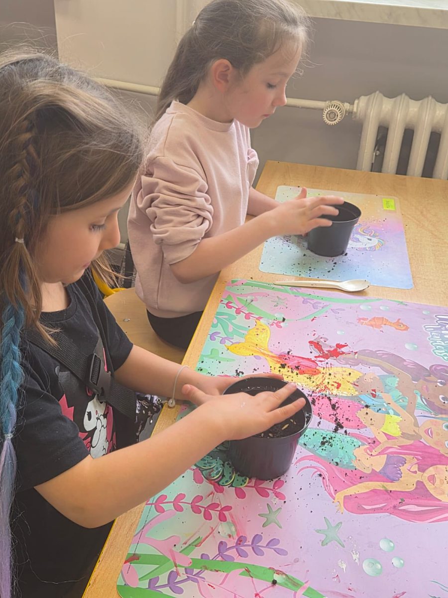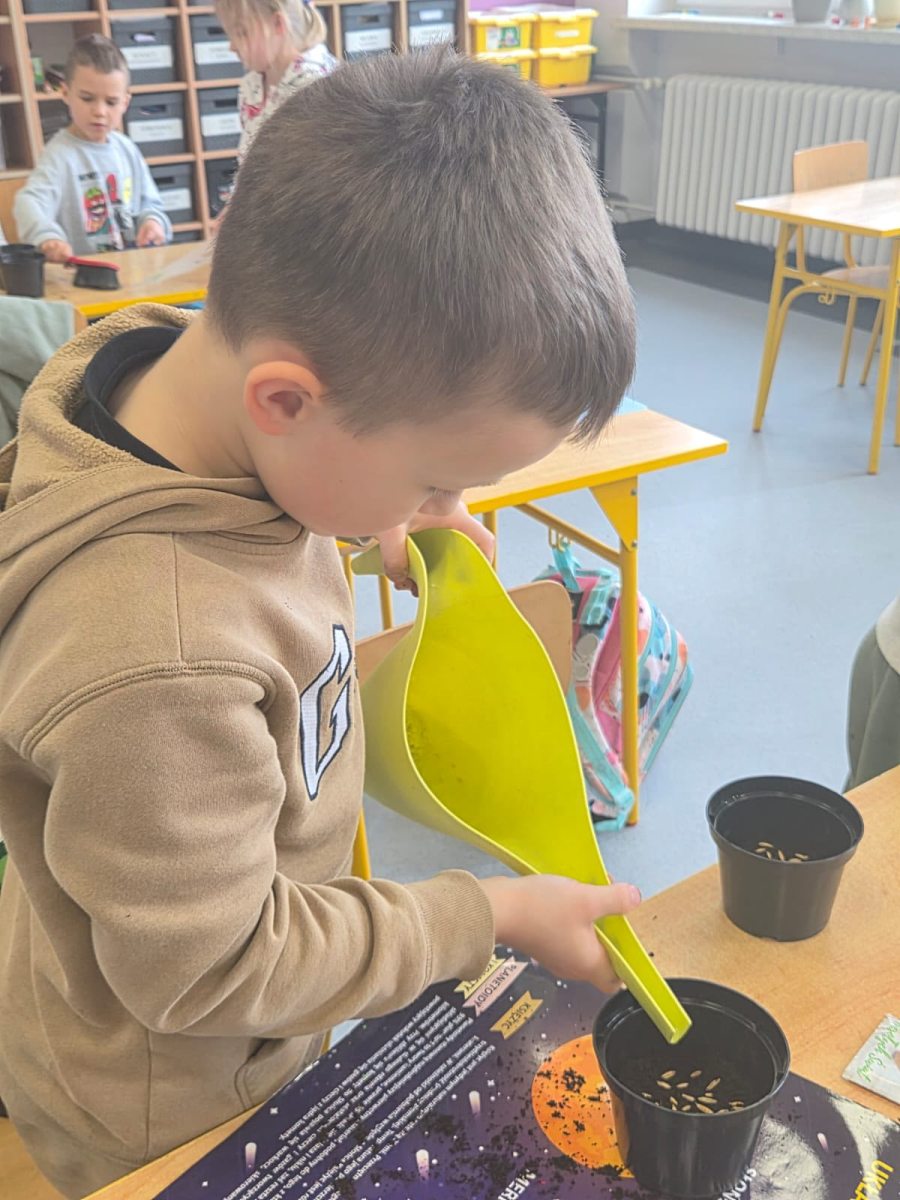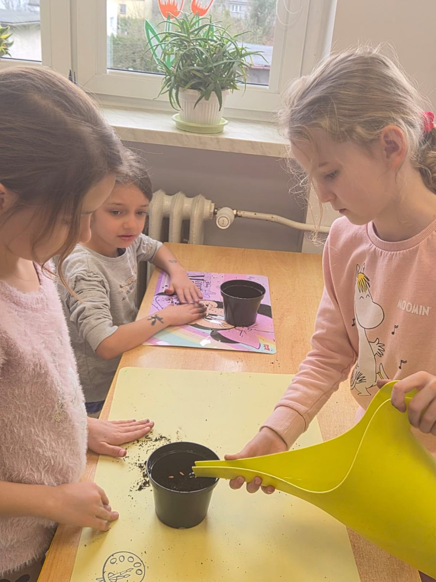 Po powrocie do szkoły dzieci z wielkim zaangażowaniem zasiały owies w przygotowanych doniczkach.Teraz z niecierpliwością będą obserwować, jak z małych ziaren wyrastają pierwsze zielone pędy.