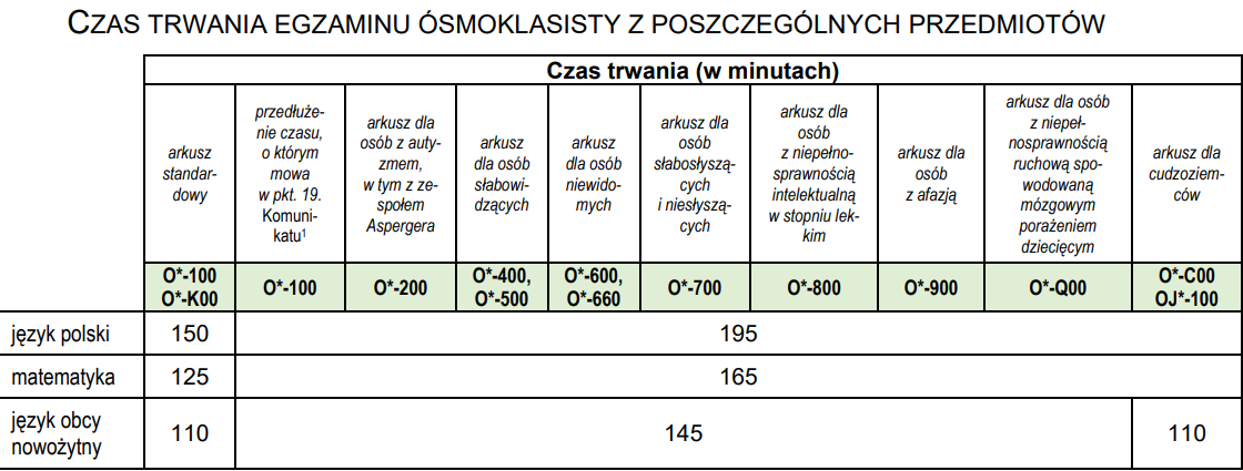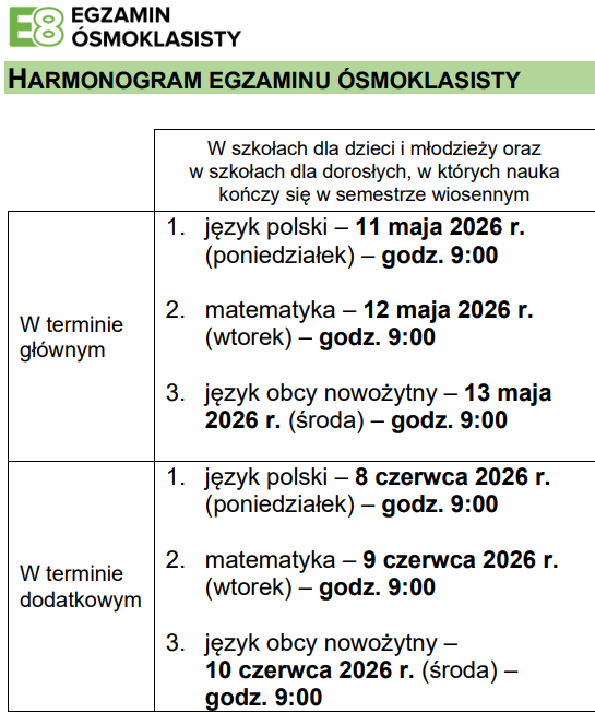 - 11 maja 2026 – egzamin z języka polskiego (150 minut arkusz standardowy, 195 minut przedłużony)