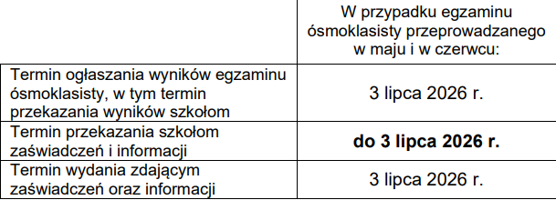 W 2026 r. uczniowie poznają swoje wyniki 3 lipca oraz 3 lipca każdy uczeń otrzyma zaświadczenie o szczegółowych wynikach egzaminu ósmoklasisty. Na zaświadczeniu podany będzie wynik procentowy oraz wynik na skali centylowej dla egzaminu z każdego przedmiotu.